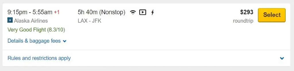 Under each search result, Expedia will assign a flight score on a scale from 1 to 10. Expedia calculates this by factoring the length of the flight, the make and model of the aircraft, and the amenities offered on the flight. This doesn’t always mean that a 10/10 flight is the best value, but if you see a high scoring flight on the cheaper end of the search results, you can trust that you’re getting a good deal.