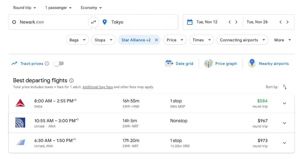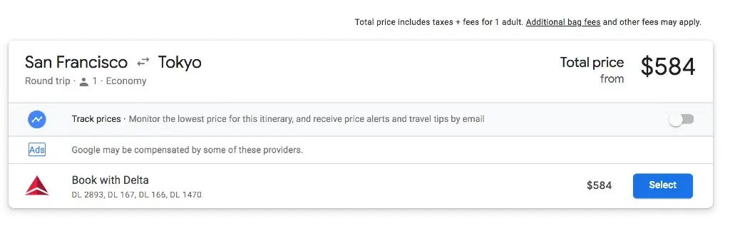 For example, say you’re interested in a deal we sent for flights to Tokyo in the $500s. In the alert, we’ll link to a sample search; in this case, it’s on Google Flights.